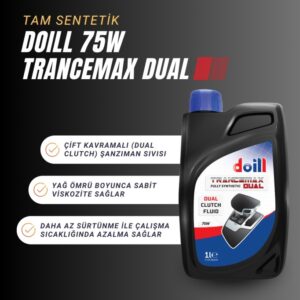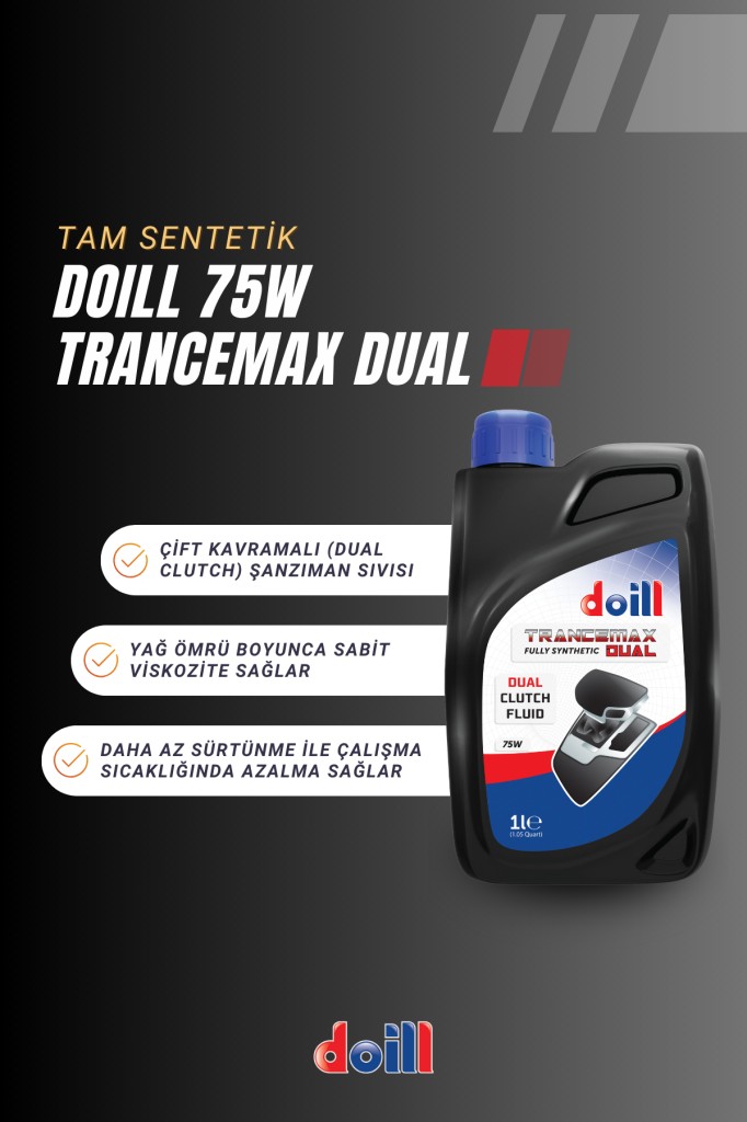 Doill TRANCEMAX Dual, tam sentetik SAE 75W viskozite değerinde, çift kavramalı (dual clutch) şanzıman sıvısıdır. Bu ürün büyük araç ve ekipman üreticilerinin, Audi, Ford, Peugeot, Renault, BMW, Porche, Volvo, Mitsubishi ve Chrysler, (Avrupa yapımı modelleri) performans değerlerini karşılar. Ayrıca Volswagen, Seat ve Skoda’nın 6 vitesli çift kavramalı (dual clutch) DSG için de kullanımı uygundur. Bunun yanında, FE 75W şanzıman yağının performans seviyesini karşılamakta olup, FE 75W şanzıman yağının kullanıldığı her yerde rahatlıkla Doill Trancemax Dual’i kullanabilirsiniz.
