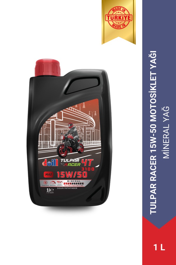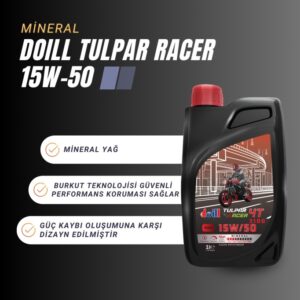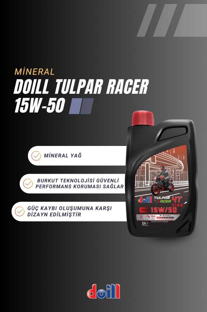 Doill TULPAR RACER 4T 15W-40 canlı motorsiklet sürüş zevkini sevenler için dizay edilmiştir. son teknoloji olan 4 zamanlı motosikletlerin motorları için geliştirilmiş, uzmanlaşmış, motor yağıdır. Özellikle de güç kaybı oluşumuna karşı motoru korumak için dizayn edilmiştir. Doill’e eklenen Burkut Teknolojisi güvenli performans koruma garantisi sağlar.