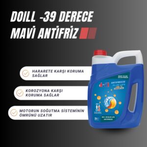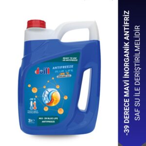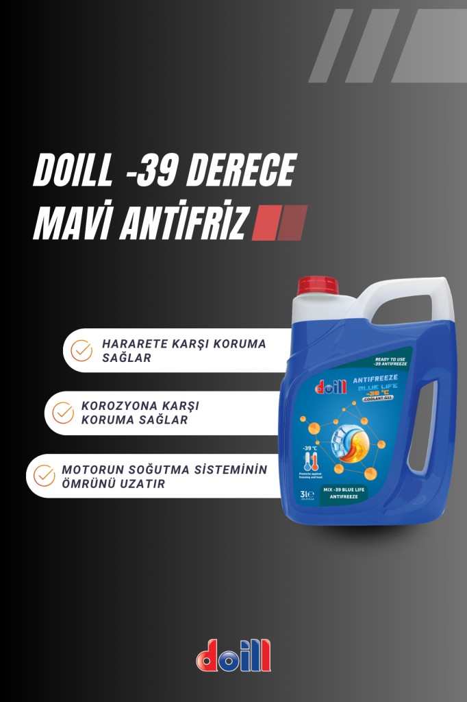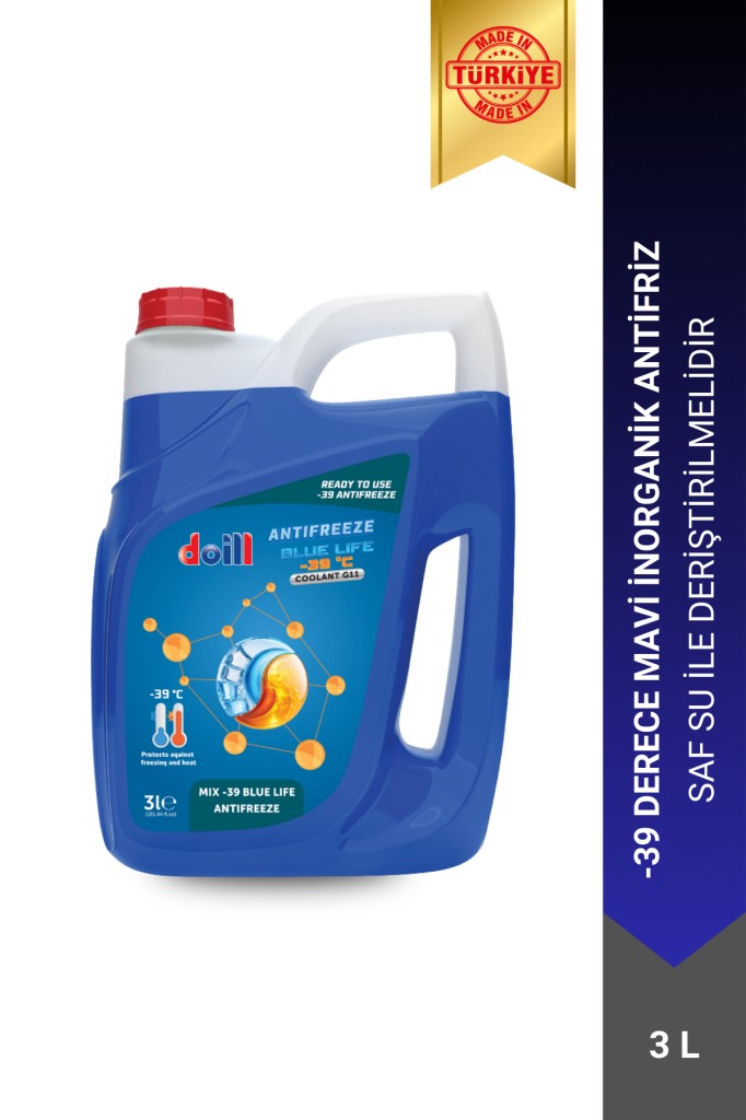 Doill BLUE LIFE ANTIFREEZE -39 °C mono etilen glikol içeren, inorganik karışım katkı maddesi teknolojisi ile harmanlanmış, soğutma sıvısı ve yumuşak suyla karıştırılarak hazırlanmış, -39 derecede kullanıma hazır antifrizdir. Bu ürün tüm mono etilen glikol bazlı inorganik soğutma sıvıları ile karıştırılabilir. Tüm soğutma sistemleri için önerilir. Binek otomobiller, ağır hizmet, inşaat ve tarım araçları, bahçe işleri, gemiler, sabit motorlar ve diğer endüstriyel uygulamalar içindir.