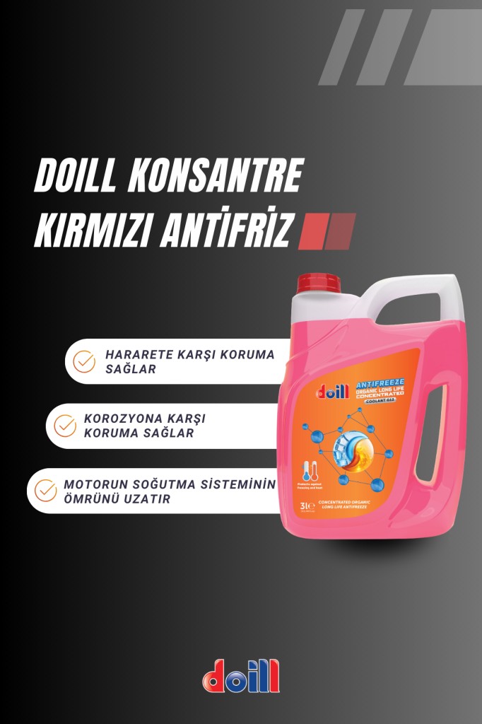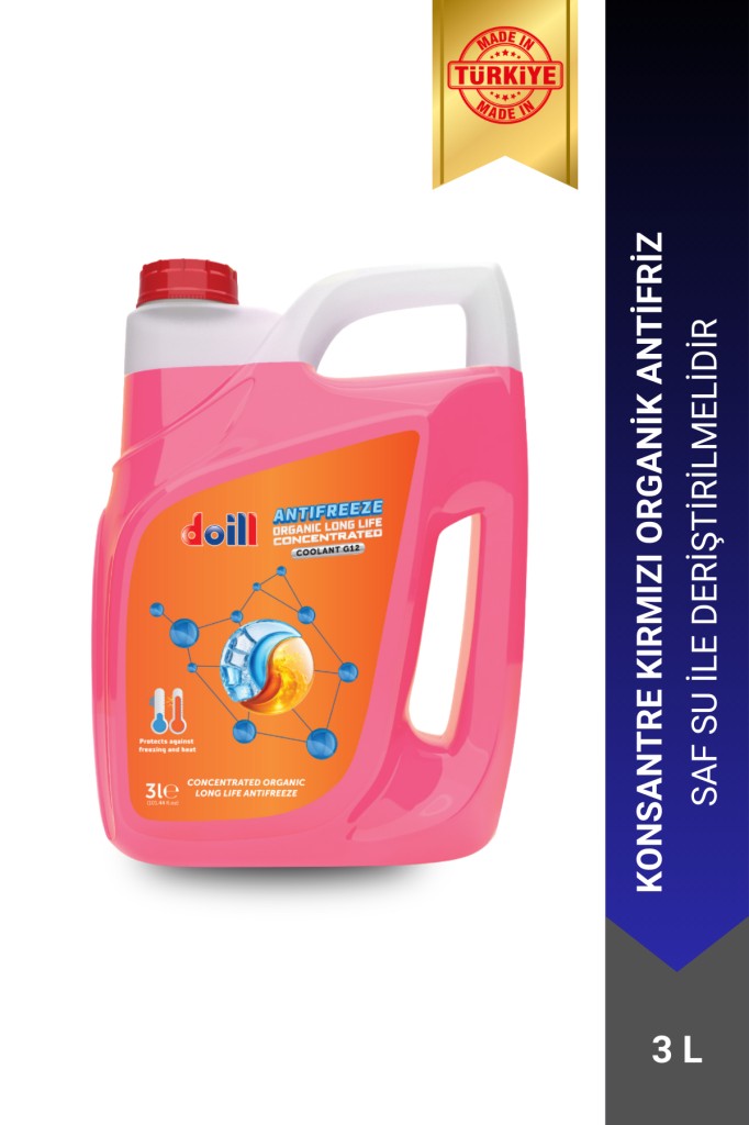 Doill ORGANIC LONG LIFE ANTIFREEZE mono etilen glikol içeren, organik katık teknolojisi (OAT) ile harmanlanmış, saf (konsantre) soğutma sıvısıdır. Maksimum performans için % 60 konsantre antifriz, %40 su, ideal performans için % 50 antifriz %50 su ile karıştırılarak kullanılmalıdır. Bu ürün tüm mono etilen glikol bazlı organik soğutma sıvıları ile karıştırılabilir. Tüm soğutma sistemleri için önerilir. Binek otomobiller, ağır hizmet, inşaat, tarım araçları, bahçe işleri, gemiler, sabit motorlar ve diğer endüstriyel uygulamalar içindir.